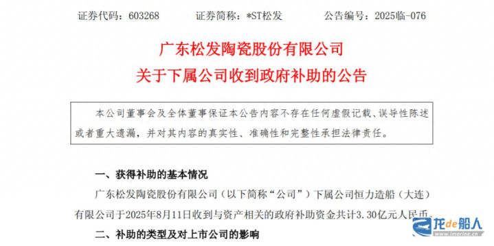 8月11日晚间,广东松发陶瓷股份有限公司(*ST松发)发布公告,该公司下属公司恒力造船(大连)有限公司于2025年8月11日收到与金钱相干的政府提拔资金规画3.30亿元东说念主民币。